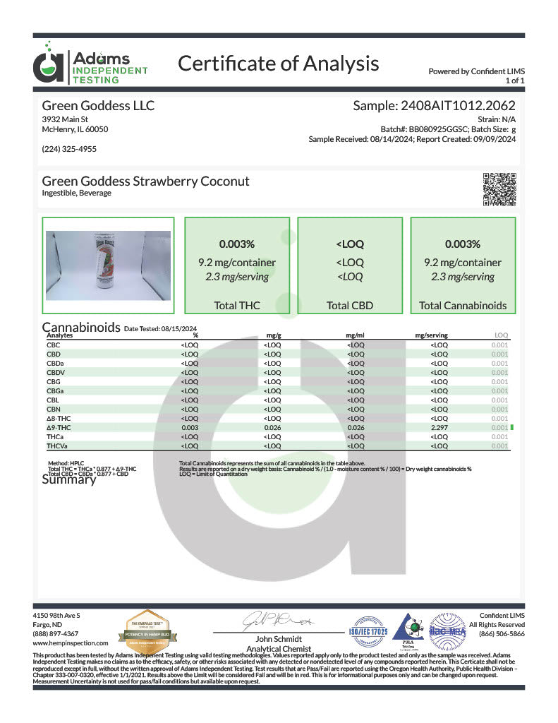 Green Goddess premium quality 10 MG Nano Delta-9 THC beverages are expertly blended and free from sugar and dye, offering the perfect alternative to the mindful consumer. Enjoy the combination of a creamy blend of ripe strawberries and coconut, for a refreshing delightful flavor.