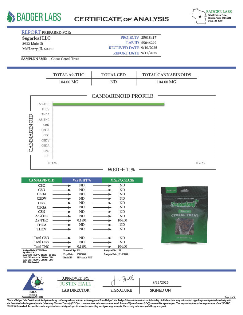 Sugarleaf 100 MG Delta-9 THC Cereal Treat in Cocoa flavor.