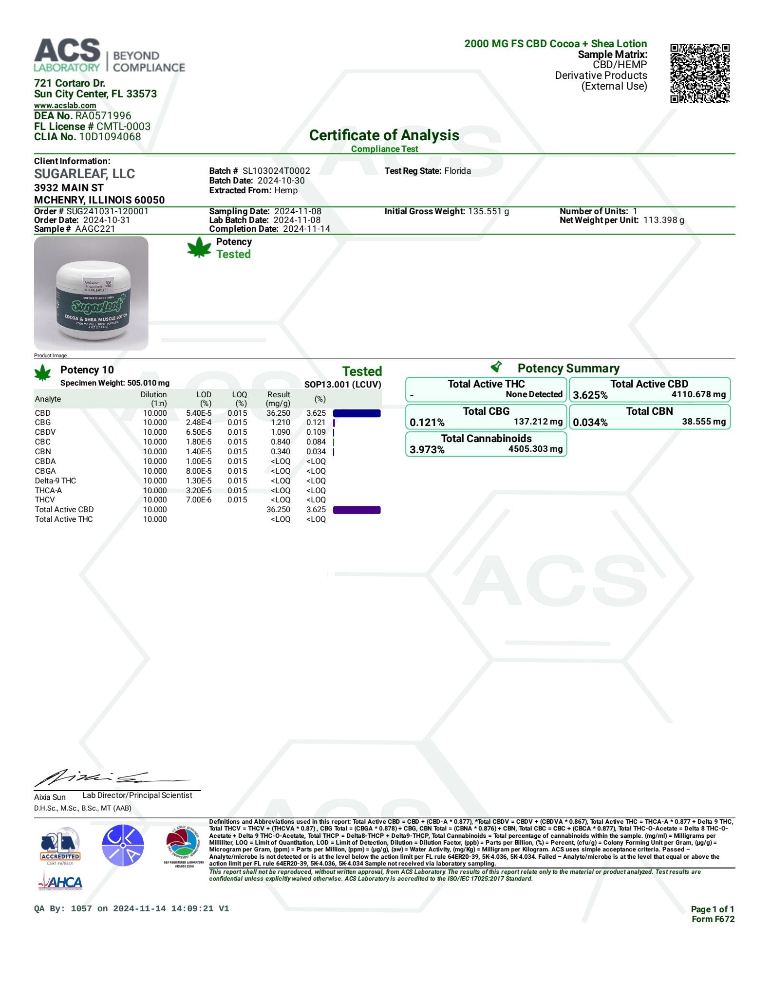 Sugarleaf 2000mg CBD + Cocoa + Shea Lotion 4 ounces