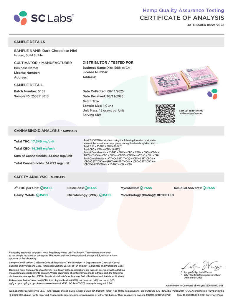Chocolate Liquor, Sugar, Cocoa Butter, Full Spectrum Hemp Extract, Sunflower Lecithin, Natural Vanilla Flavoring
