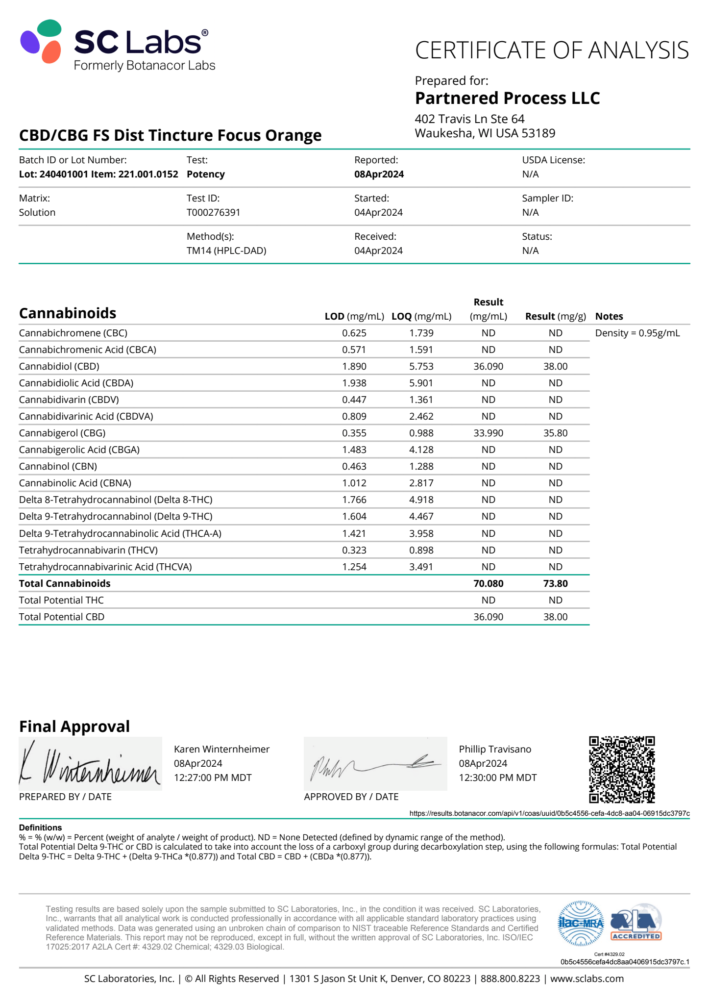 Partnered Reserve Focus Full Spectrum Tincture CBD 1000mg CBG 1000mg Focus Terpene Profile 1fl oz Orange Flavor