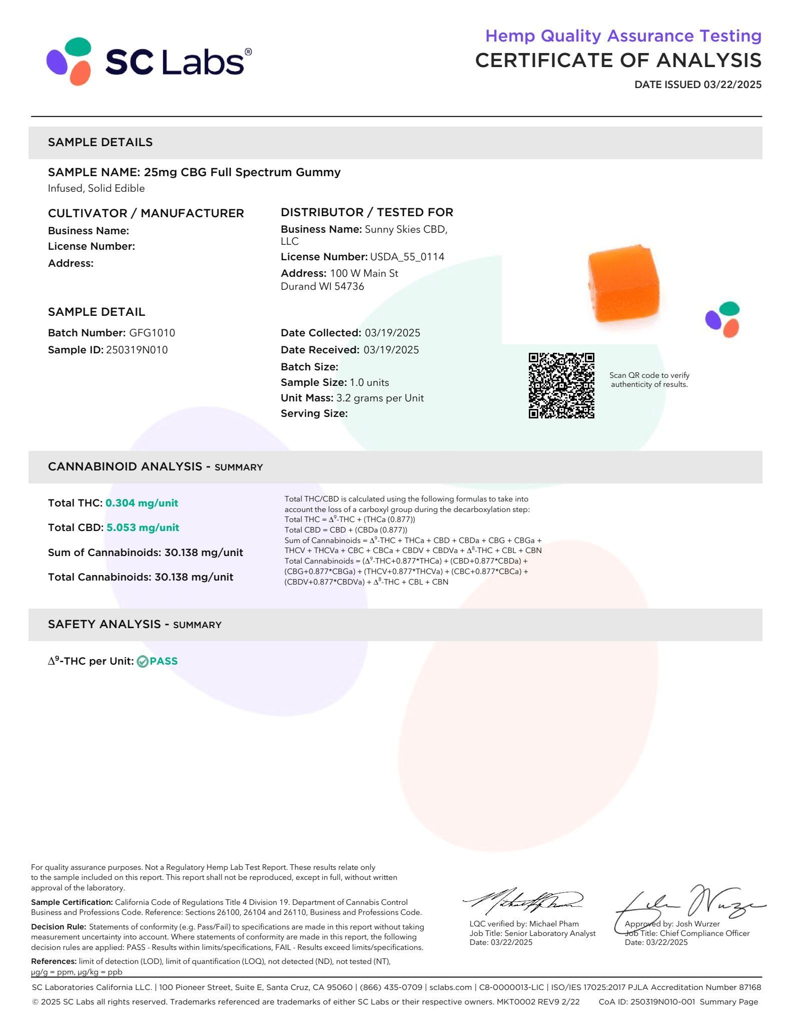 – Sunny Skies CBD is a USDA Licensed Food Manufacturer in the State of Wisconsin and makes all CBD products, including edibles, in its GMP-compliant lab in Durand, WI.