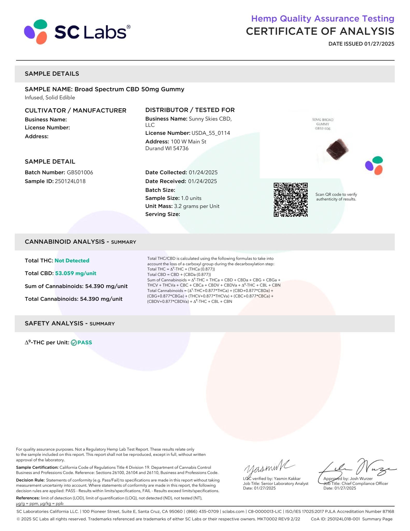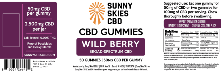 – Sunny Skies CBD is a USDA Licensed Food Manufacturer in the State of Wisconsin and makes all CBD products, including edibles, in its GMP-compliant lab.