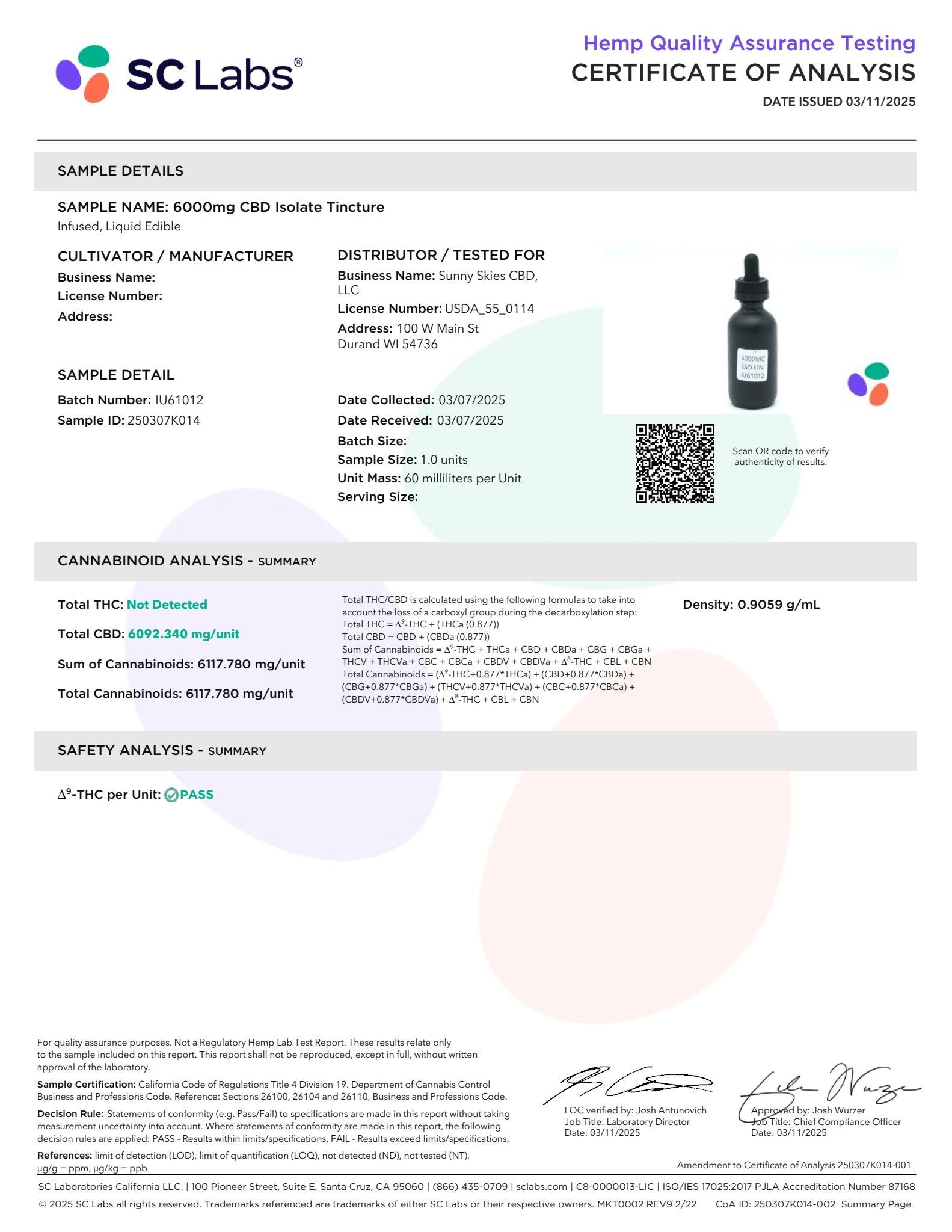 Sunny Skies 6000mg CBD Isolate Tincture Unflavored 60ml