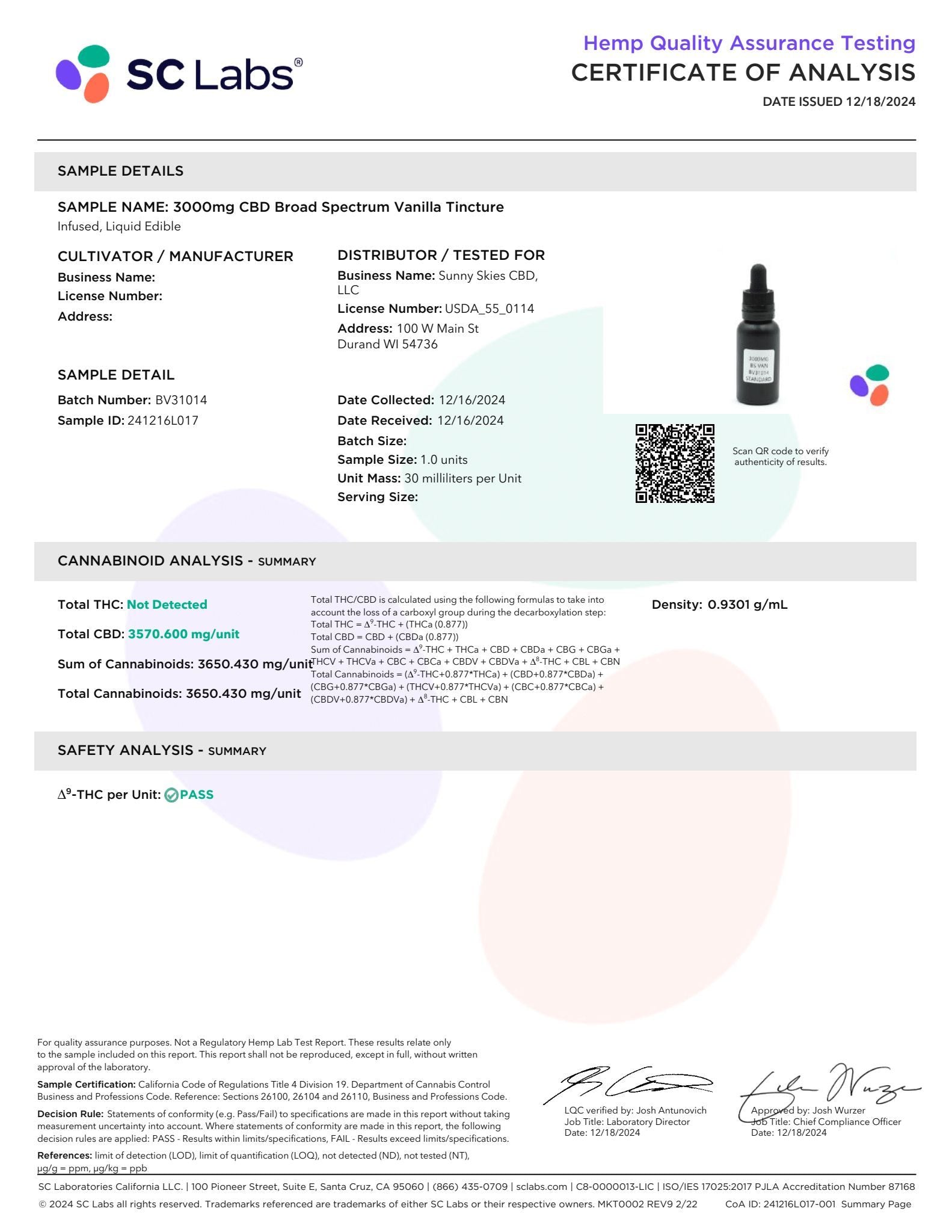Sunny Skies Broad Spectrum 3000mg CBD Tincture Vanilla