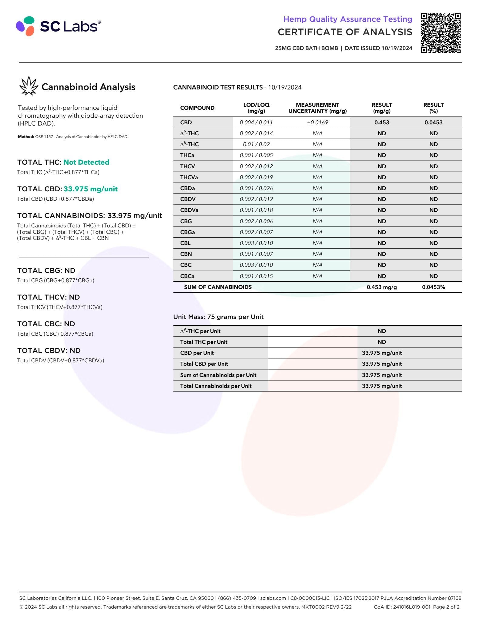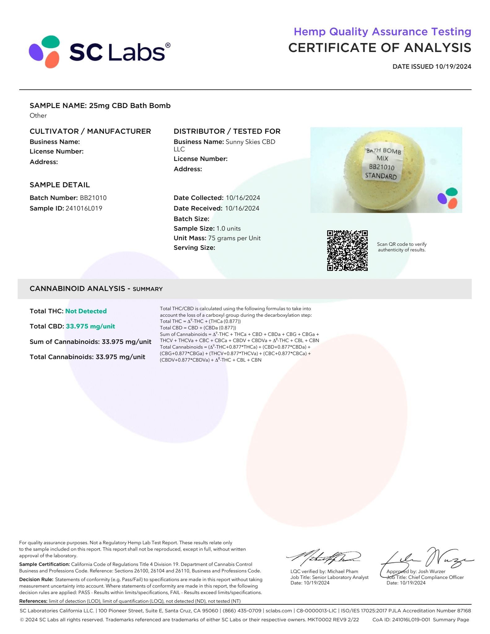 -Single-serve, 25mg CBD per bath bomb – 100mg CBD in 4-pack package. Diameter of 2 inches, net weight of 67 grams (2.3 oz.). Does not contain THC (0.00% THC).