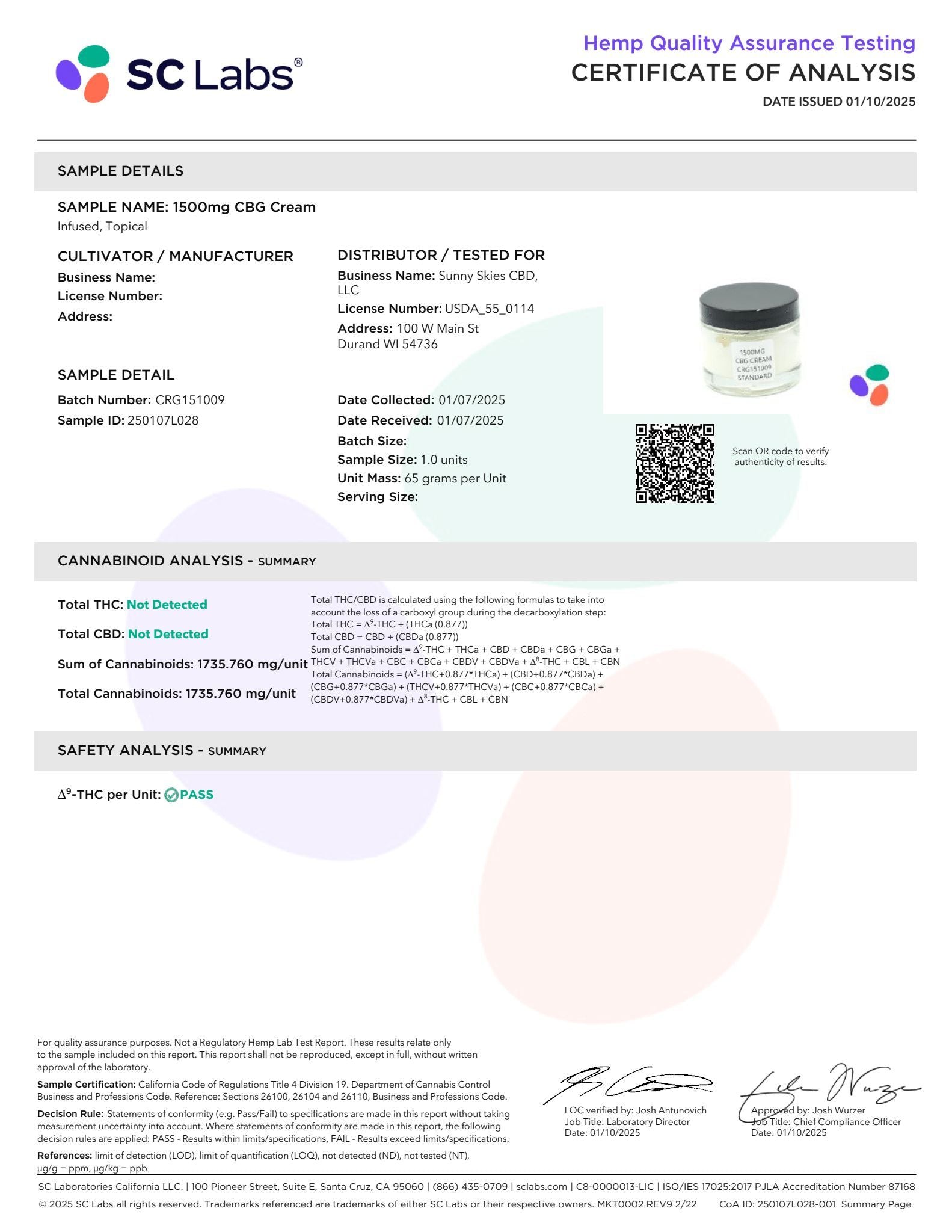 Sunny Skies CBG Cream 1500mg Recover Moisturize Soothe 2.3oz