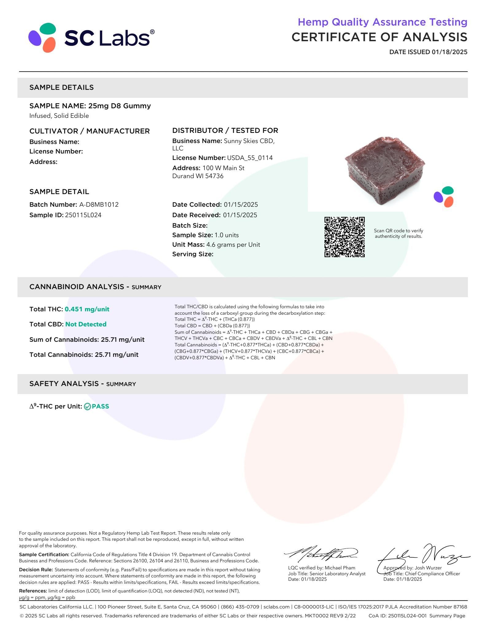 – Sunny Skies CBD is a Licensed Food Manufacturer in the State of Wisconsin and makes all CBD products, including edibles, in its GMP-compliant lab.