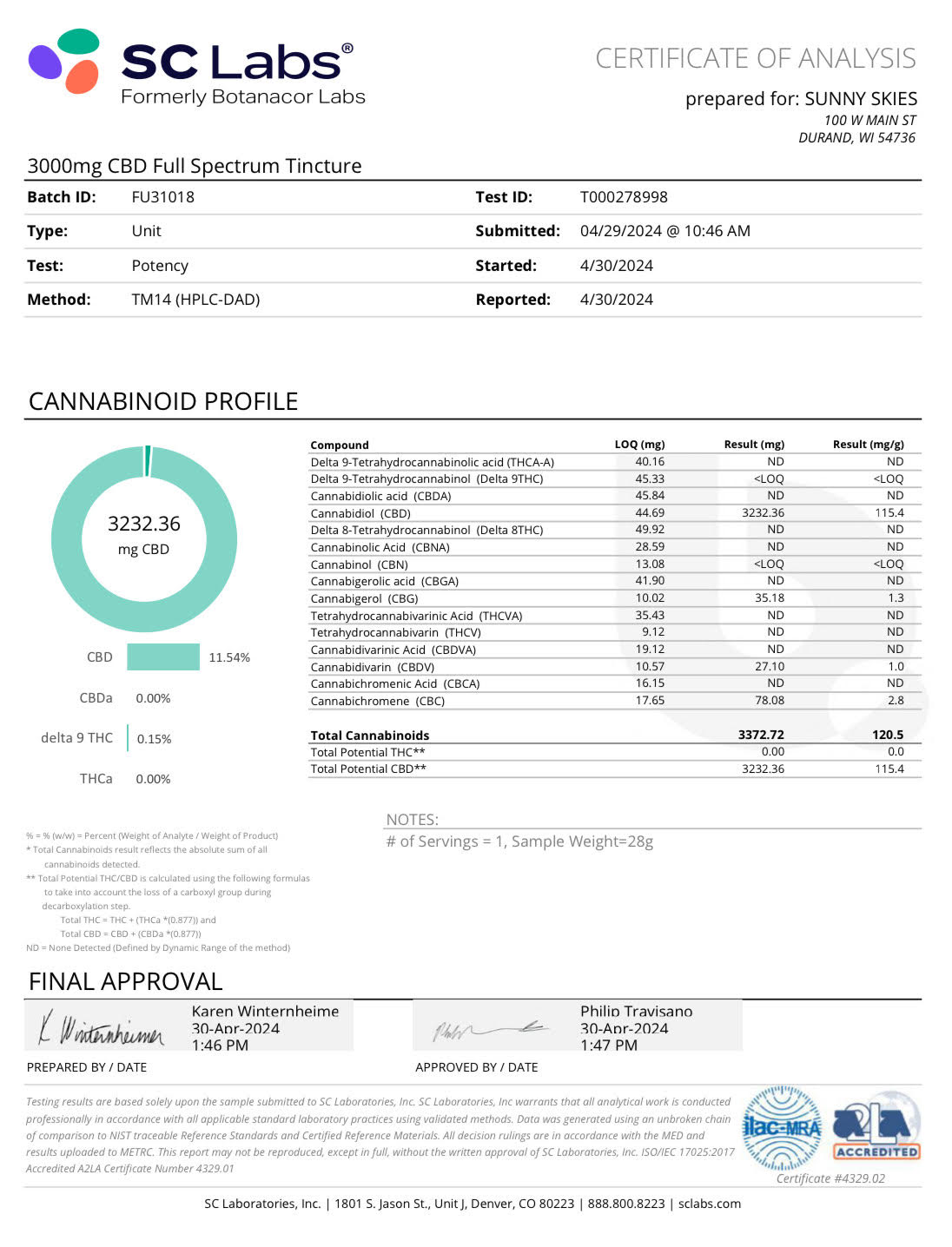 Sunny Skies Full Spectrum Tincture CBD 3000mg 30ml Unflavored