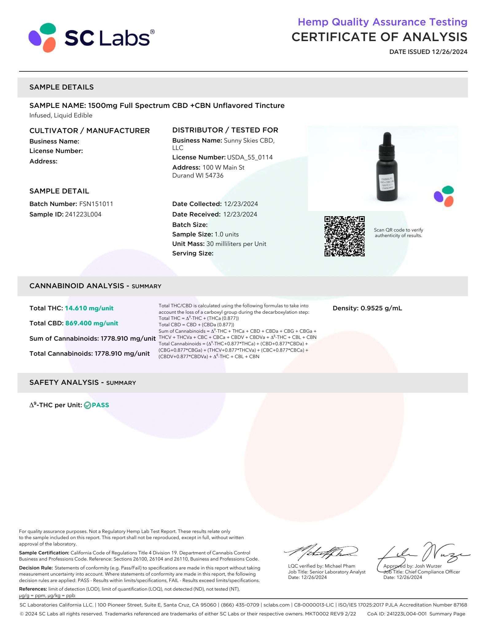 Sunny Skies Full Spectrum CBD+CBN 1500mg Tincture Unflavored