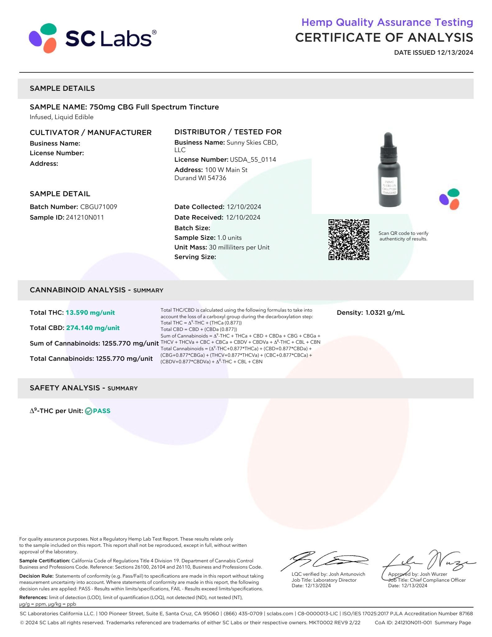 Sunny Skies Full Spectrum CBD + CBG 750mg Tincture Unflavored